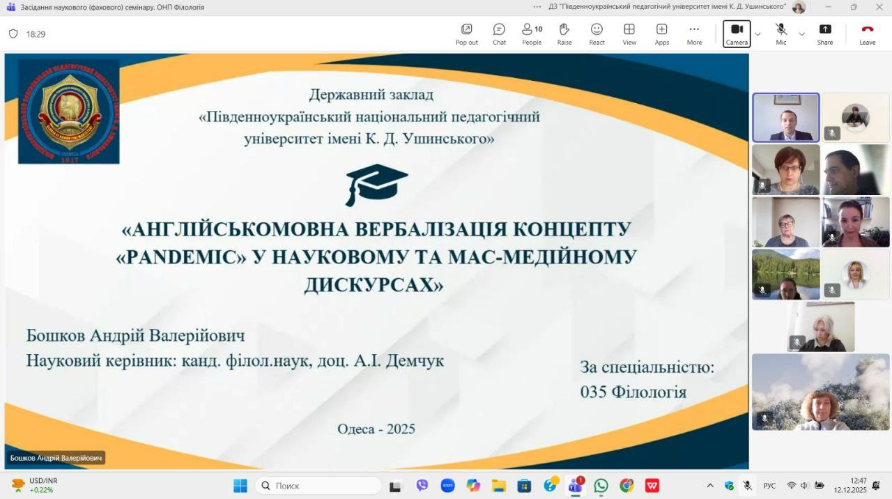 12.12.2025 року відбувся фаховий (науковий) семінар, під час якого аспірант третього року навчання за освітньо-науковою програмою «Філологія» Андрій Бошков представив результати свого дисертаційного дослідження за темою: «Англійськомовна вербалізація концепту «PANDEMIC» у науковому та MAC-медійному дискурсах». У доповіді було висвітлено основні теоретико-методологічні засади роботи, ключові положення наукової новизни, а також практичне значення отриманих результатів для сучасної філологічної науки.