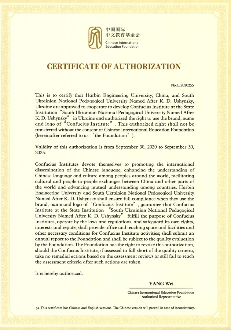 Освітньо-культурний центр «Інститут Конфуція» Південноукраїнського національного педагогічного університету імені К. Д. Ушинського отримав дозвіл від КНР на провадження своєї діяльності на оновленій платформі, що засвідчує відповідний сертифікат Міжнародного освітнього фонду китайської мови. Офіційним партнером у реалізації міжнародного проєкту Університету Ушинського з китайської сторони виступає Харбінський інженерний університет.