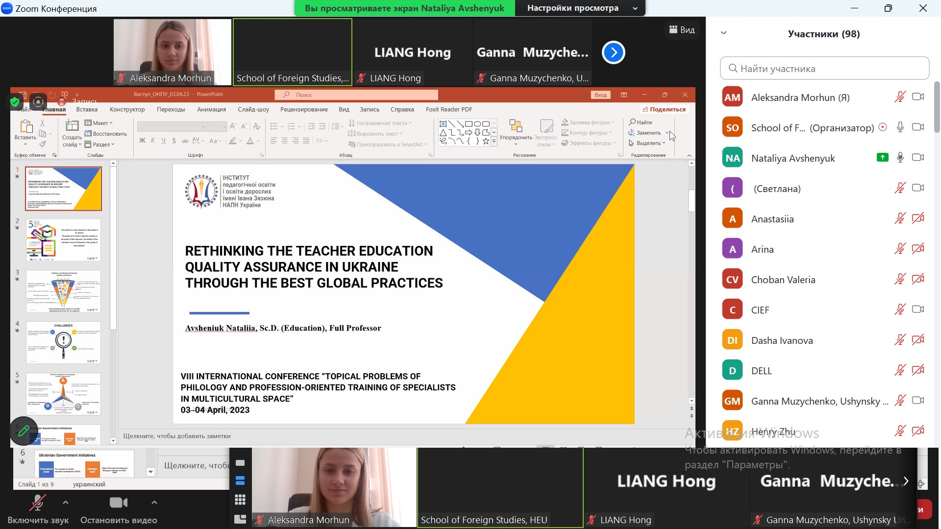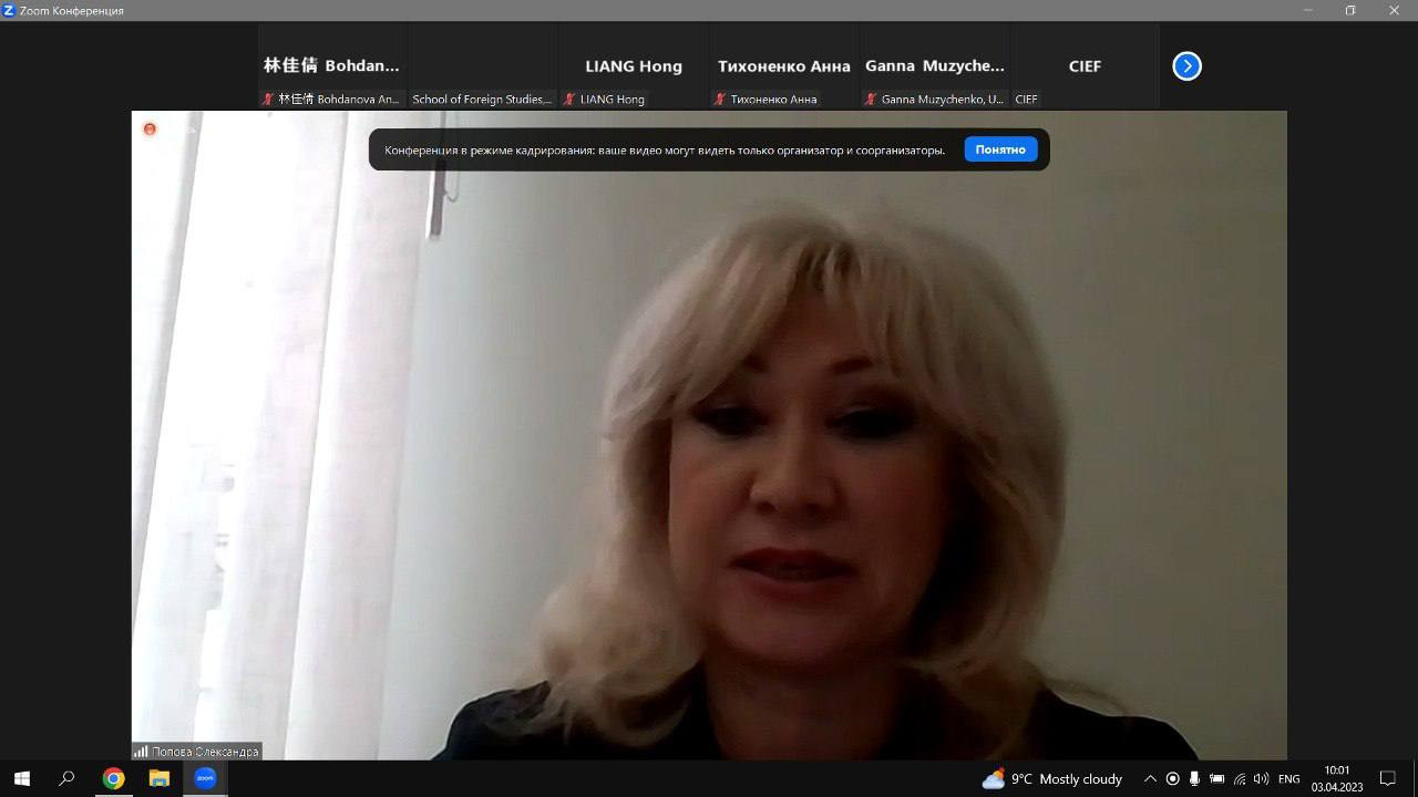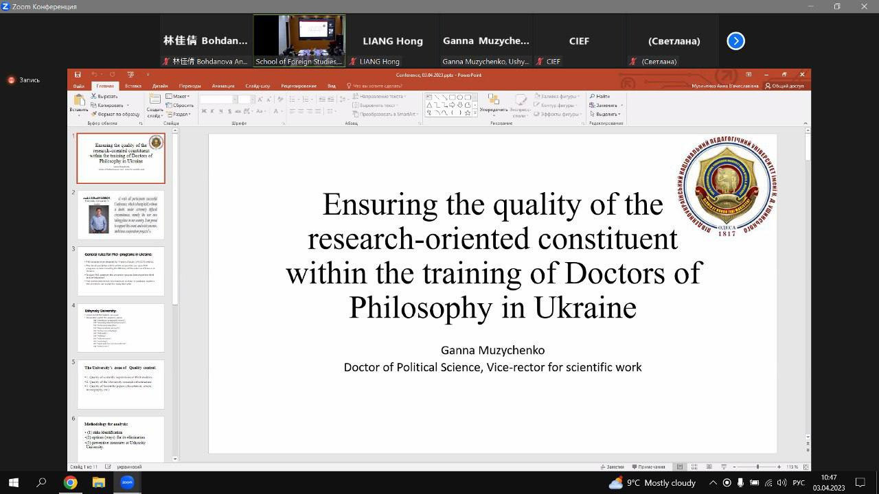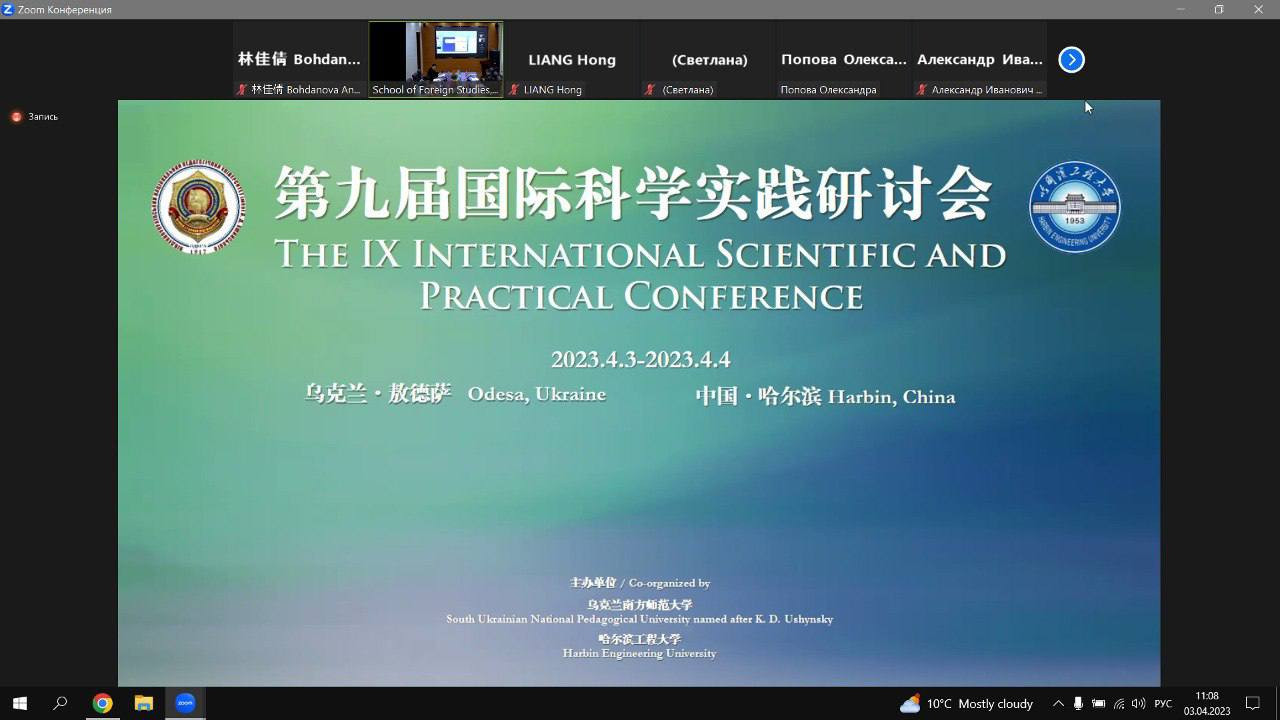 03-04 квітня 2023 року кафедрою перекладу і теоретичної та прикладної лінгвістики Державного закладу «Південноукраїнський національний педагогічний університет імені К. Д. Ушинського» і Харбінським інженерним університетом було проведено ІХ Міжнародну наукову онлайн конференцію «Актуальні проблеми філології і професійної підготовки фахівців у полікультурному просторі», в якій взяли участь провідні науковці, викладачі іноземних мов і студенти.