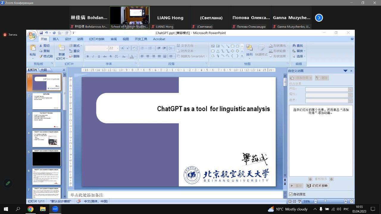 На пленарному засіданні професори китайських університетів-партнерів виступили з доповідями стосовно наукових досягнень у галузі філології, зокрема декан факультету іноземних мов університету Бейхан, професор Лян Маочен (“ChatGPT as a Tool for Linguistic Analysis”) та декан факультету іноземних мов Харбінського інженерного університету, професор Чжу Дяньйон (“A Study on Translation for Characteristic Industries Based on Corpus”).