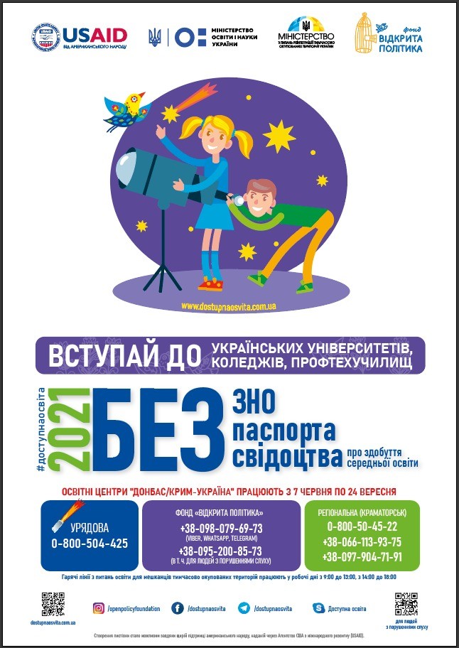 Інформаційні матеріали щодо особливостей проведення вступної кампанії 2021 для дітей, які проживають на тимчасово окупованих територіях України, про умови та порядок вступу до освітніх закладів, що розміщенні на підконтрольних Україною територіях.