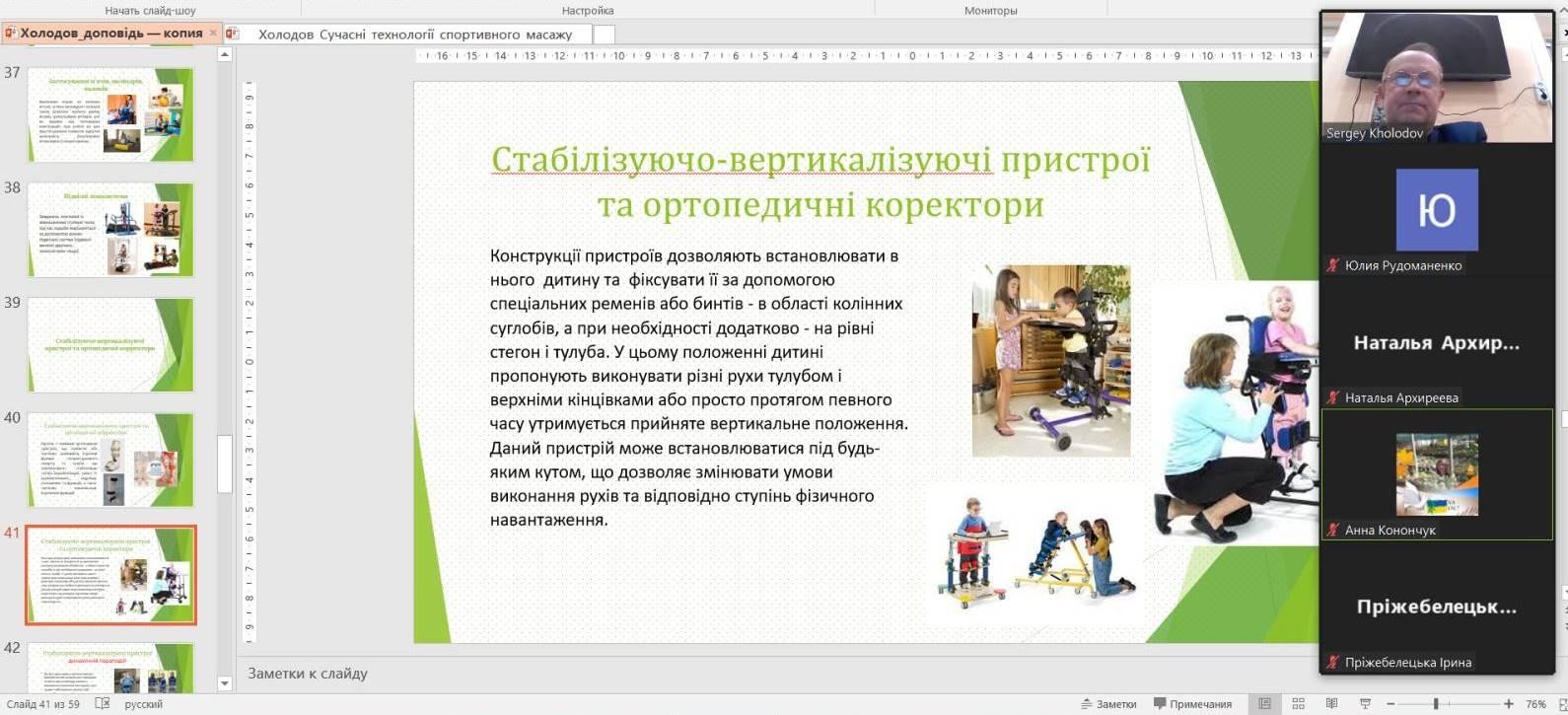 24 травня 2022 року на базі Південноукраїнського центру професійного розвитку керівників та фахівців соціономічної сфери Університету Ушинського в рамках курсів підвищення кваліфікації фахівців зі спеціальності 017 Фізична культура і спорт «Сучасні технології у сфері фізичної реабілітації та ерготерапії» відбувся онлайн-семінар кандидата педагогічних наук, доцента, приват-професора кафедри біології і охорони здоров’я Холодова Сергія Анатолійовича «Сучасні технології масажу та реабілітації дітей з порушеннями опорно-рухового апарату та нервової системи».