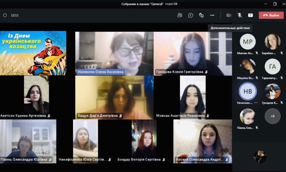 Зі здобувачами освіти другого (магістерського) рівня другого року навчання, професором кафедри дефектології та фізичної реабілітації Соколовою Ганною Борисівною, була проведена кураторська година з теми «14 жовтня - День українського козацтва і захисника України». На кураторській годині були розглянуті історія виникнення свята та зазначена необхідність та актуальність проведення заходу.
