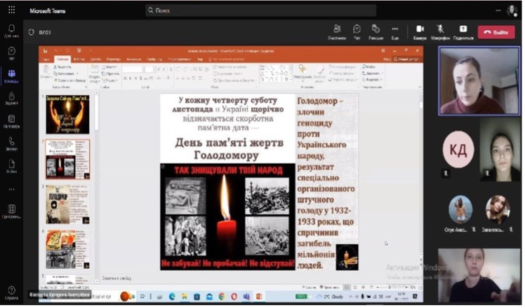 У кожну четверту суботу листопада в Україні щорічно відзначається скорботна пам’ятна дата – День пам’яті жертв Голодомору. З цього приводу доцентом кафедри біології і охорони здоров’я Університету Ушинського Філіпцовою Катериною Анатоліївною проведено виховну роботу зі студентами 3 року навчання спеціальності 014 Середня освіта (Фізична культура).