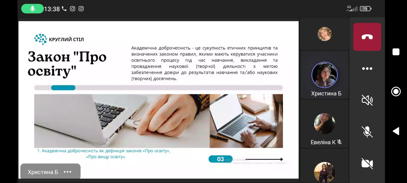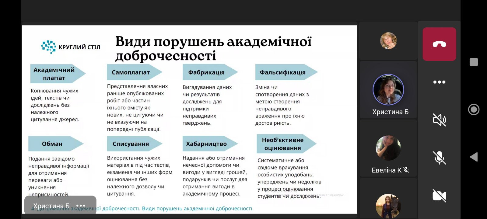 У четвер, 28 березня 2024 року здобувачі освіти другого року денної форми навчання спеціальності Середня освіта (Математика) разом з куратором академічної групи від кафедри вищої математики та статистики Ольгою Болдарєвою долучилися до круглого столу «Академічна доброчесність в освітньому середовищі», що був організований кафедрою освітнього менеджменту та публічного управління на чолі з Оксаною Сакалюк.Студенти-доповідачі обговорили практичне використання етичних принципів у науковій діяльності, зміст і обсяг поняття «академічна доброчесність» та висвітлили актуальні питання дотримання академічної доброчесності в освітньому середовищі.