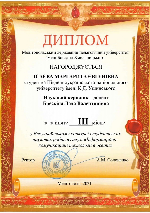 За результатами конкурсу диплом ІІІ ступеня отримала Ісаєва Маргарита Євгенівна, студентка 2 року навчання за першим (бакалаврським) рівнем спеціальності 014.04 Середня освіта (Математика) фізико-математичного факультету Університету Ушинського.