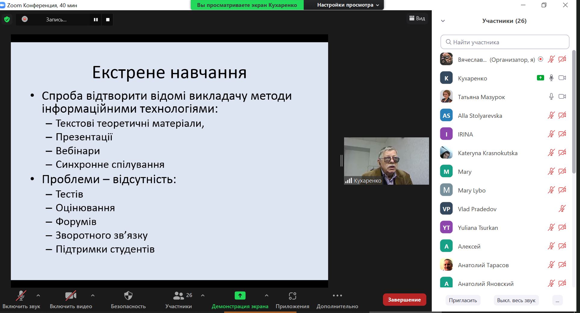 В рамках проведення конференції було проведено майстер-клас професора Кухаренка В.М. «РОЗВИТОК ЕКСТРЕНОГО ДИСТАНЦІЙНОГО НАВЧАННЯ», під час якого учасники ознайомились з можливостями, перевагами та деякими технологічними особливостями роботи з програмним середовищем Learning Designer, за допомогою якого можна автоматизувати процес планування навчальної діяльності в умовах змішаного навчання.