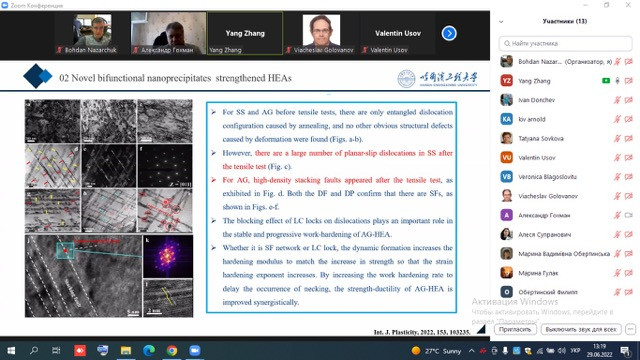 Доктор Чжан у своєї лекції доповів про особливості високоентропійних сплавів та стратегію щодо одночасного поліпшення їх пластичних та міцних властивостей.