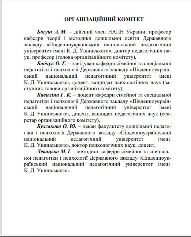 03.11.2023 року у стінах факультету дошкільної педагогіки та психології, на кафедрі сімейної та спеціальної педагогіки і психології Державного закладу «Південноукраїнський національний педагогічний університет імені К. Д. Ушинського» відбулася ІІІ-я Всеукраїнська конференція здобувачів вищої освіти і молодих учених «АКТУАЛЬНІ ПРОБЛЕМИ ДОШКІЛЬНОЇ ОСВІТИ: ТЕОРІЯ ТА ПРАКТИКА»
