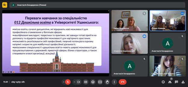 Ключовим моментом зустрічі було представлення завідувачкою кафедри теорії та методики дошкільної освіти Людмилою Березовською освітньо-професійних програм (ОПП) факультету дошкільної педагогіки та психології, а саме: «Дошкільна освіта. Практична психологія в закладах дошкільної освіти» та «Дошкільна освіта. Логопедія в закладах дошкільної освіти». З потенційними абітурієнтами було обговорено особливості навчання на ОПП, окреслено переваги навчання в Університеті Ушинського (участь у наукових проєктах, грантах, стипендійні програми), можливості продовження навчання за другим (магістерським) рівнем вищої освіти, перспективи правцевлаштування.