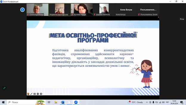 26 квітня 2024 року з ініціативи гаранта освітньо-професійної програми «Дошкільна освіта. Практична психологія в закладах дошкільної освіти» за другим (магістерським) рівнем вищої освіти, докторки педагогічних наук, професорки, завідувачки кафедри теорії та методики дошкільної освіти Людмили Березовської відбулося обговорення освітньо-професійної програми зі стейкголдерами та роботодавцями. У ході онлайн-зустрічі Людмила Іванівна наголосила на важливості співпраці наукової спільноти зі стейкголдерами, щодо удосконалення змісту освітньо-професійної програми, забезпечення її відповідності до вимог сьогодення.