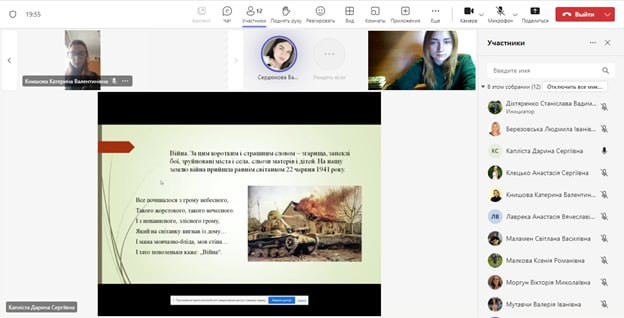 Людмила Березовська спільно зі здобувачами другого (магістерського) рівня вищої освіти спеціальності 012 «Дошкільна освіта» факультету дошкільної педагогіки та психології, ознайомила присутніх із історією дати та наголосила, що на сьогодні, Україна відзначає День пам’яті та примирення в умовах повномасштабної збройної агресії росії. Сучасна війна також супроводжується жахливими воєнними злочинами з боку російської армії та політично-військового керівництва рф. Бомбардування Києва, Харкова, Одеси, Дніпра, Запоріжжя, Херсона, Миколаїва, депортація людей, фільтраційні табори. На жаль, сторінки з підручників історії про Другу світову війну стали реальністю сьогодення.