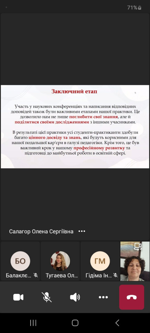 Під час зустрічі здобувачі поділилися враженнями про результати проходження виробничої (асистентської) практики. У своїх доповідях студенти-практиканти зазначили, що практика надала їм можливість спробувати себе у ролі викладача, навчилися оцінювати, аналізувати та проводити заняття відповідно до сучасних вимог. Це є чудовою нагодою удосконалити та апробувати на практиці набуті теоретичні знання, виробити практичні уміння та навички.