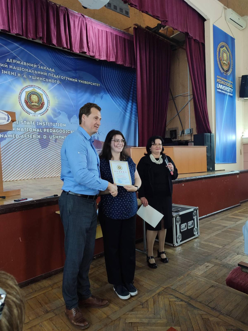 Професорсько-викладацький колектив кафедри теорії та методики дошкільної освіти Університету Ушинського вітає з перемогою (1 місце) у Всеукраїнському конкурсі студентських наукових робіт, здобувачку 4-го курсу спеціальності 012 «Дошкільна освіта» Валерію САРАЖАН та наукового керівника, доцентку кафедри теорії та методики дошкільної освіти Ірину ПОПОПОВУ.
