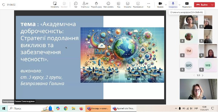 Під час обговорення учасники розглянули ключові аспекти академічної доброчесності, зокрема: значення дотримання етичних норм у наукових дослідженнях та освітньому процесі; основні порушення академічної доброчесності (плагіат, фабрикація та фальсифікація даних, самоплагіат тощо); відповідальність викладачів і студентів за недотримання принципів доброчесності; механізми запобігання порушенням та роль внутрішніх систем забезпечення якості освіти; міжнародний досвід формування культури академічної доброчесності.