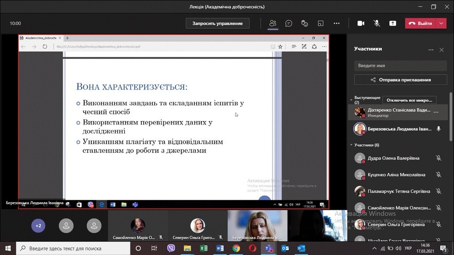 17 березня зі студентами-магістрами спеціальності 012 «Дошкільна освіта» в.о. завідувачкою кафедри теорії та методики дошкільної освіти в режимі on-line навчання було проведено лекцію на тему: «Академічна доброчесність – запорука якісної освіти».