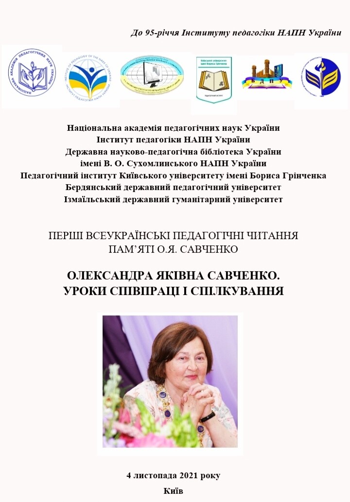 04 листопада 2021 р. в Національній академії педагогічних наук України відбулися І Всеукраїнські педагогічні читання, присвячені пам’яті Олександри Яківни Савченко. В роботі конференції взяла участь професор кафедри теорії і методики дошкільної освіти, академік НАПН України Алла Богуш.