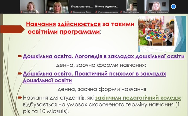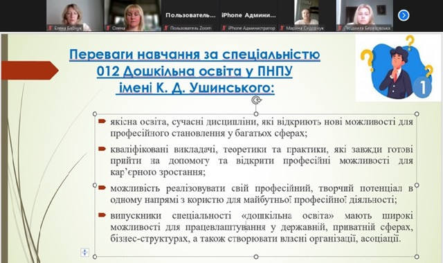 У ході зустрічі з випускниками завідувачкою кафедри теорії та методики дошкільної освіти Людмилою Березовською та завідувачкою кафедри сімейної та спеціальної педагогіки та психології Оленою Бабчук було представлено презентацію та розкрито особливості навчання на факультеті дошкільної педагогіки та психології Університету Ушинського. Студенти з цікавістю слухали інформацію про особливості навчання на освітньо-професійних програмах «Дошкільна освіта. Логопедія в закладах дошкільної освіти» та «Дошкільна освіта. Практична психологія в закладах дошкільної освіти», можливості працевлаштування, переглянули майстер-класи та ворк-шопи, які підготували студенти старших курсів спеціальності Дошкільна освіта.