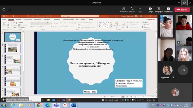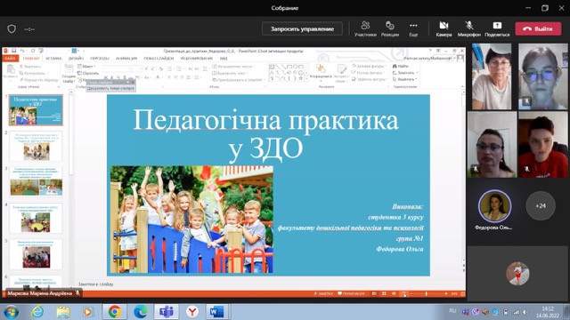 14 червня 2022 року в онлайн форматі на платформі Тeams відбулася звітна конференція за підсумками проходження здобувачами третього року навчання спеціальності 012 Дошкільна освіта, виробничої педагогічної практики в групах передшкільного віку. Студенти гідно представили результати своєї роботи відповідно до вимог програми практики. Звіти та підготовлені презентаційні матеріали практики засвідчили вміння здобувачів освітнього процесу використовувати набуті теоретичні знання у процесі безпосередньої практичної діяльності. Пишаємося нашими студентами та бажаємо подальших успіхів та нових професійних здобутків.