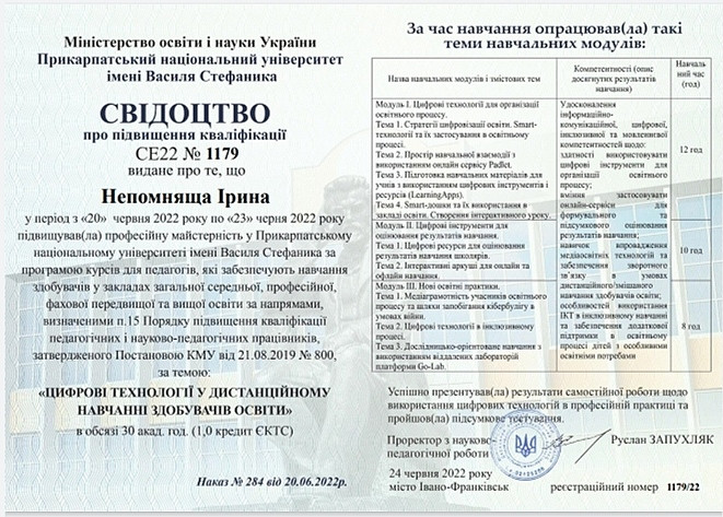 Днями завершилися тренінги та вебінари для освітян на базі центру «PNU ECOSYSTEM» Прикарпатського національного університету імені Василя Стефаника. Участь у тренінгах та вебінарах взяла завідувачка кафедри теорії та методики дошкільної освіти д.п.н., професор Людмила Березовська та доцент кафедри теорії та методики дошкільної освіти Ірина Непомняща. У процесі роботи тренери ознайомили присутніх із цифровими платформами та інноваційними методиками викладання у закладах освіти. По завершенню навчання викладачі успішно пройшли підсумкове тестування та отримали сертифікати, які засвідчують підвищення професійної компетентності.