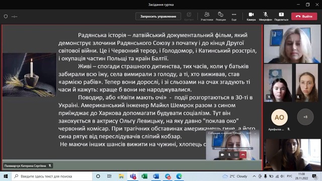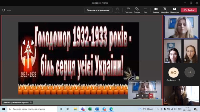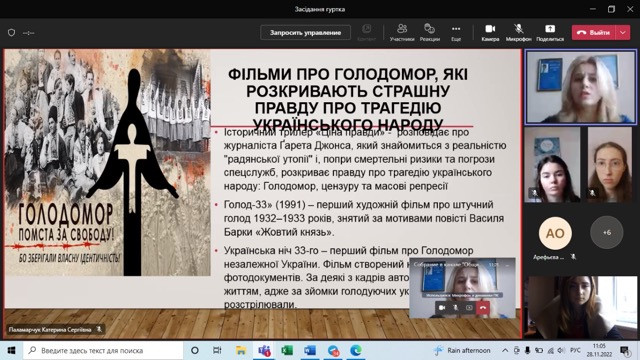 Під час заходу студенти-гуртківці переглянули презентацію «Голодомор 1932-1933 років – біль серця усієї України», порівняли її з подіями сьогодення. Ірина Попова наголосила на вагомості цієї пам’ятної дати, адже саме пам’ять та розуміння великої трагедії українського народу має велике значення для історії України. Вони не знищили нас у 1930-х роках, не знищать і у 2022 р.