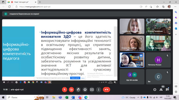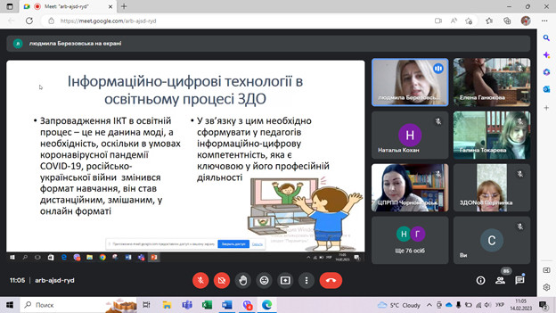 У ході зустрічі Людмила Іванівна наголосила, що в умовах сьогодення, інформатизація освіти – це один із важливих механізмів модернізації освітньої системи України. Сучасні ІКТ відкривають нові перспективи для підвищення ефективності освітнього процесу, тому так важливо сформувати у педагогів інформаційно-цифрову компетентність, яка є ключовою у їх професійній діяльності. Педагоги поділилися своїм досвідом роботи з дітьми дошкільного віку в умовах онлайн навчання, дізналися про нові цифрові платформи, які доцільно використовувати в роботі з дітьми дошкільного віку.