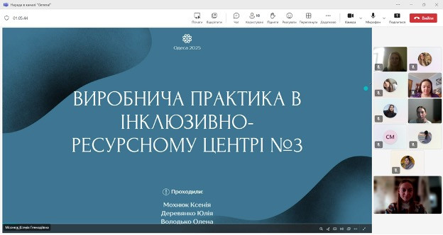 4 березня 2025 року відбулася підсумкова конференція з виробничої практики (в інклюзивно-ресурсних центрах) здобувачів вищої освіти денної форми навчання першого (бакалаврського) рівня спеціальності Спеціальна освіта четвертого року навчання. Керівники практики, професор Г.Б. Соколова та доцент кафедри спеціальної та інклюзивної освіти і реабілітації В.І. Галущенко.