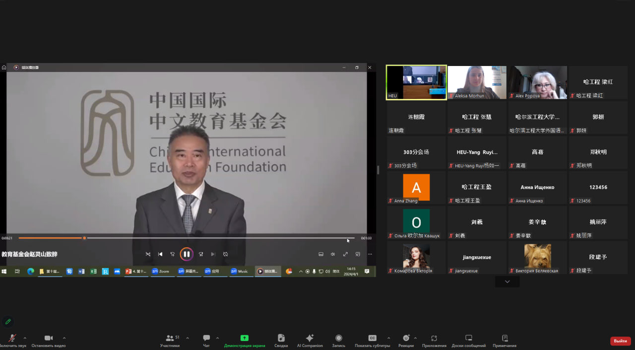 Зі вступною промовою виступили пан Чжао Ліншань, заступник голови, генеральний секретар Китайського міжнародного освітнього фонду (Харбін, Китай); пан Ні Баоюй, доктор наук, професор, начальник міжнародного відділу обміну та співробітництва Харбінського інженерного університету (Харбін, Китай); пан Чжу Дяньйонг, професор, декан Школи іноземних досліджень (Харбін, Китай) і Наталія Михайлівна Авшенюк, доктор педагогічних наук, завідувач відділу зарубіжних систем педагогічної освіти та освіти дорослих Інституту педагогічної освіти і освіти дорослих імені Івана Зязюна НАПН України.