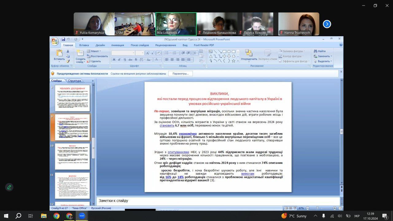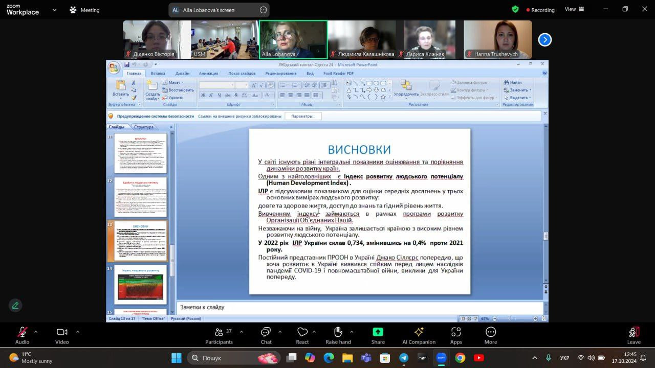 Здобувачі першого (бакалаврського) рівня вищої освіти спеціальності 035 «Переклад», члени студентського наукового гуртка «Південноукраїнські наукові студії» (керівник проф. Оксана Петінова) 17-18 жовтня 2024 року взяли участь у міжнародній науково-практичній конференції «Посилення консолідації суспільства та ролі людського капіталу на шляху вступу України та республіки Молдова до Європейського Союзу», організаторами якої є кафедра філософії, соціології та менеджменту соціокультурної діяльності Університету Ушинського, Південноукраїнське відділення Соціологічної асоціації України, Асоціація соціологів та демографів Молдови. До участі в конференції долучилися науковці Інституту соціології НАН України, Центра Соціології та Соціальної психології Кишинівського державного університету Республіки Молдова, ЗВО Києва, Одеси, Харкова, Кривого Рогу. В панельній дискусії обговорено актуальні питання, пов'язані з визначенням чинників соціальної консолідації під час війни, виклики та шляхи відтворення людського капіталу України в умовах війни, особливості ідентичності вимушених українських мігрантів, проблеми та перспективи інтеграції української освіти та науки в європейський освітньо-науковий простір, практичні аспекти зміцнення консолідації суспільства у воєнний час. Студенти представили наукові розвідки на тему «Безпека людини: захист громадян від дій дезінформації та маніпулювання громадською думкою» (Анастасія Лисяк), «Міжнародна співпраця та ефективність заходів безпеки» (Анастасія Груша), «Безпека людини як пріоритет державної політики» (Білоровська Альона), «Безпека людини: захист громадян від соціальних ризиків і загроз безпеці» (Вікторія Діденко), «Соціальна безпека як елемент європейської інтеграції» (Колісніченко Ксенія), «Роль медіа та інформаційних технологій у забезпеченні безпеки громадян» (Комариця Юлія), «Сivil security in the context of disinformation and protecting against social risks and strengthening the resilience of society» (Мазур Юлія), «Соціальна безпека в питаннях забезпечення стабільності розвитку країни» (Софія Падун), «Механізми захисту громадян від маніпулювання громадською думкою: роль медіа» (Марія Савельєва), «Безпека людини: захист громадян від дій дезінформації» (Анастасія Ягольницька). Тези доповідей будуть представлені в збірнику матеріалів конференції.