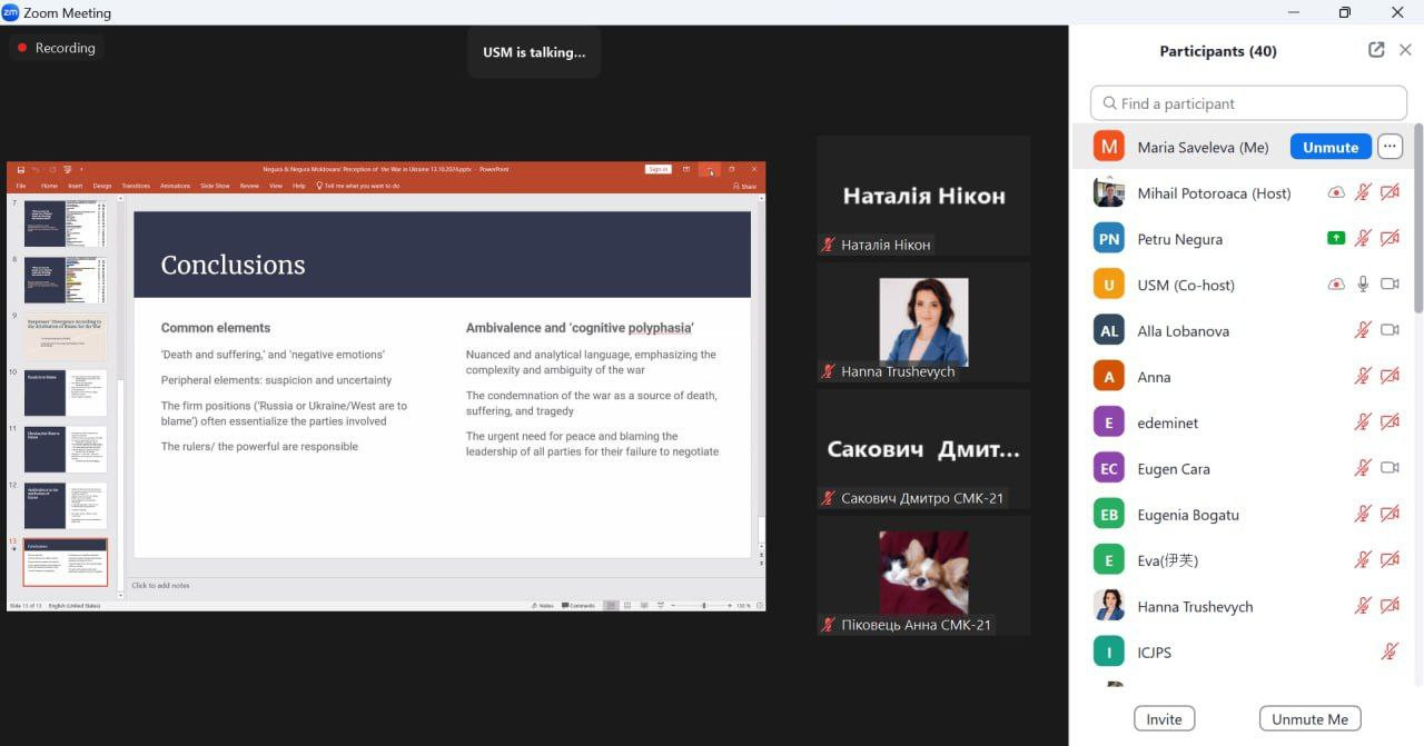 Здобувачі першого (бакалаврського) рівня вищої освіти спеціальності 035 «Переклад», члени студентського наукового гуртка «Південноукраїнські наукові студії» (керівник проф. Оксана Петінова) 17-18 жовтня 2024 року взяли участь у міжнародній науково-практичній конференції «Посилення консолідації суспільства та ролі людського капіталу на шляху вступу України та республіки Молдова до Європейського Союзу», організаторами якої є кафедра філософії, соціології та менеджменту соціокультурної діяльності Університету Ушинського, Південноукраїнське відділення Соціологічної асоціації України, Асоціація соціологів та демографів Молдови.