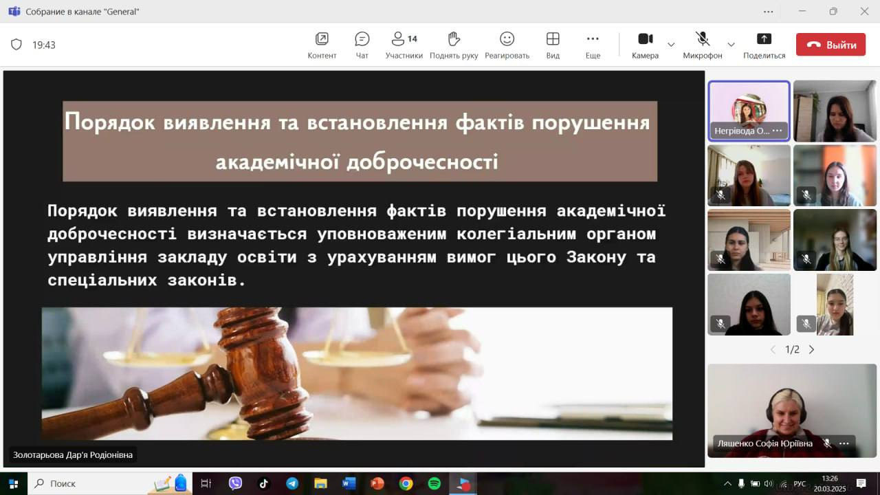 Студенти були ознайомлені з основними принципами доброчесності, з видами порушень академічної доброчесності, а також з наслідками недотримання академічної доброчесності.