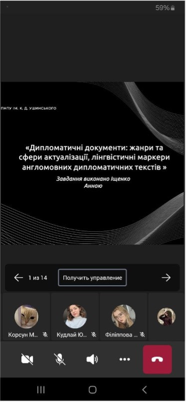 11 квітня 2025 року відбулося засідання проблемної групи «Актуальні проблеми сучасного перекладознавства» під керівництвом д.філол.н., доц. Світлани ЛЮБИМОВОЇ. У засіданні взяли участь завідувачка кафедри перекладу і теоретичної та прикладної лінгвістики Ілона ДЕРІК, здобувачі вищої освіти третього і четвертого курсів першого (бакалаврського) рівня, лауреати конкурсу студентських наукових робіт Юлія КУДЛАЙ та Ірина ШПИТКО та учасники ХІ Міжнародної конференції «Актуальні проблеми філології і професійної підготовки фахівців у полікультурному просторі» Анна ІЩЕНКО, Елеонора ПОПОВИЧ та Вікторія БЄЛЯЄВСЬКА.