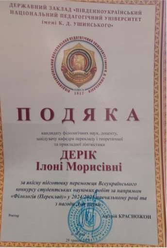 Також Дерік І.М. одержала Подяку від адміністрації Університету Ушинського за якісну підготовку переможця Всеукраїнського конкурсу студентських наукових робіт за напрямом «Філологія (Переклад)» у 2024/2025 навчальному році, Шпитко Ірини Мирославівни.