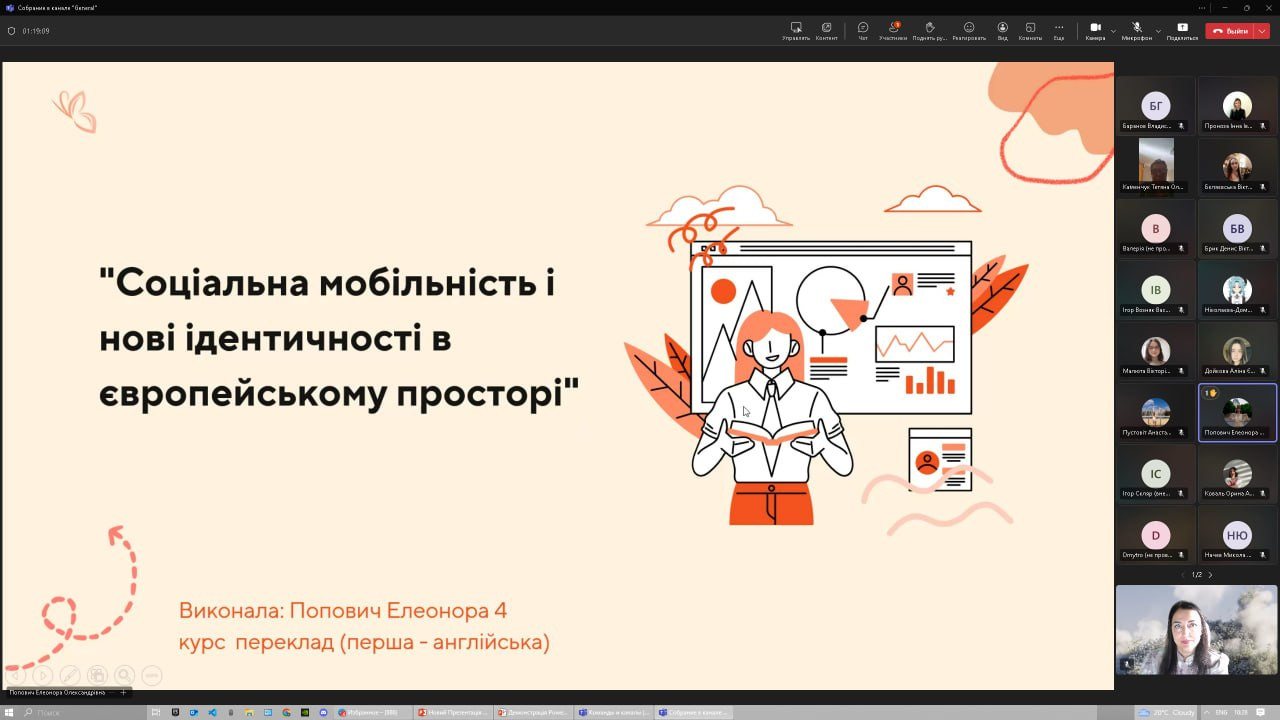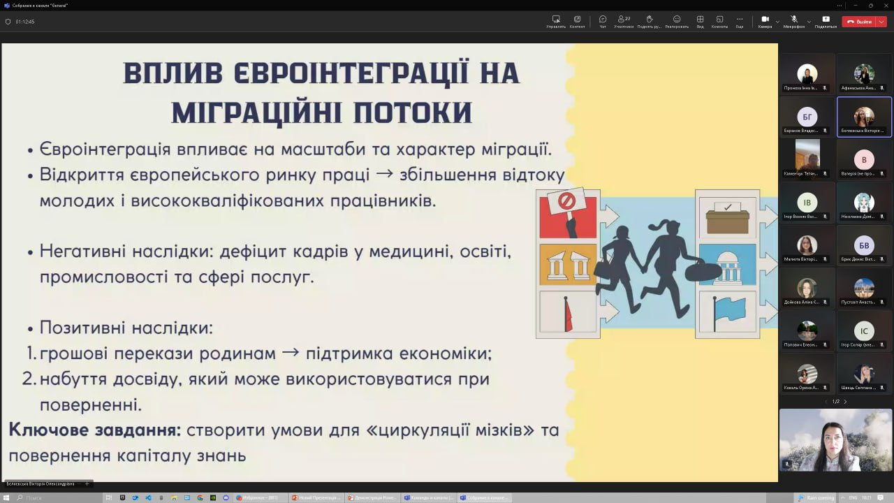 10 вересня 2025 року здобувачі першого (бакалаврського) рівня вищої освіти ОПП «Переклад (перша – англійська, друга – китайська)» Ткаченко Анастасія, Іщенко Анна, Бєляєвська Вікторія та Попович Елеонора, члени студентського наукового гуртка «Південноукраїнські наукові студії» (керівник – проф. Петінова О. Б.), в межах заходів щодо реалізації Стратегії комунікації з питань європейської інтеграції України (розпорядження МОН від 25.06.2025 р. № 622-р) взяли активну участь у Міжкафедральному круглому столі на тему «Європейська інтеграція: виклики та перспективи крізь призму політики, філософії й соціокультурних практик». У фокусі дискусій розглядалися питання трансформації українського суспільства в умовах євроінтеграції: від ролі довіри й соціального капіталу до викликів міграції, тіньової зайнятості та нових ідентичностей; цінності бізнесу, сталий розвиток і політичні аспекти – баланс суверенітету, вплив гібридної війни, молодіжна участь. Європейська інтеграція постала як багатовимірний процес, що змінює структури, цінності та ідентичності. Формат діалогу не лише створив майданчик для міждисциплінарного обговорення, а й сприяв формуванню ключових компетентностей: аналітичного та критичного мислення, аргументованого висловлення власної позиції, навичок академічної дискусії, міждисциплінарного бачення суспільних процесів та інтеграції наукових підходів із практичними викликами сучасності.