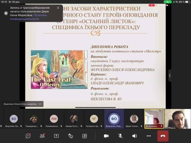 Слід відзначити доповіді з презентацією Павленко Валерії Віталіївни (науковий керівник д.філол.н., проф. Любимова Світлана Анатоліївна), Царюка Дмитра Юрійовича (науковий керівник д.філол.н., проф. Іліаді Олександр Іванович), Чупригіна Артура Геннадійовича (науковий керівник д.філол.н., проф. Іліаді Олександр Іванович), Фу Валерії (науковий керівник к.філол.н., доц. Дерік Ілона Морисівна), Кривої Руслани Ростиславівни (науковий керівник к.філол.н., доц. Дерік Ілона Морисівна), Геращенко Аліни Сергіївни (науковий керівник д.пед.н., проф. Попова Олександра Володимирівна) та Чжан Чи (науковий керівник д.пед.н., проф. Попова Олександра Володимирівна). Всі ці здобувачі вищої освіти захистили магістерські роботи на «відмінно». Окремо слід звернути увагу, на той факт, що Чупригін А.Г. наразі перебуває у лавах ЗСУ, а Чжан Чи знаходиться на академічній мобільності у Харбінському інженерному університету і нещодавно отримала нагороду “Special Contribution Award”.