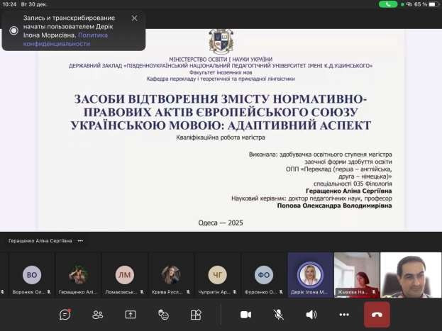 29.12. 2025 та 30.12.2025 на кафедрі перекладу і теоретичної та прикладної лінгвістики факультету іноземних мов відбулись захисти магістерських робіт випускників ОПП другого (магістерського) рівня «Переклад (перша- англійська, друга-німецька)» спеціальності 035 Філологія вступу 2024-2025 н.рр.денної та заочної форм здобуття освіти.