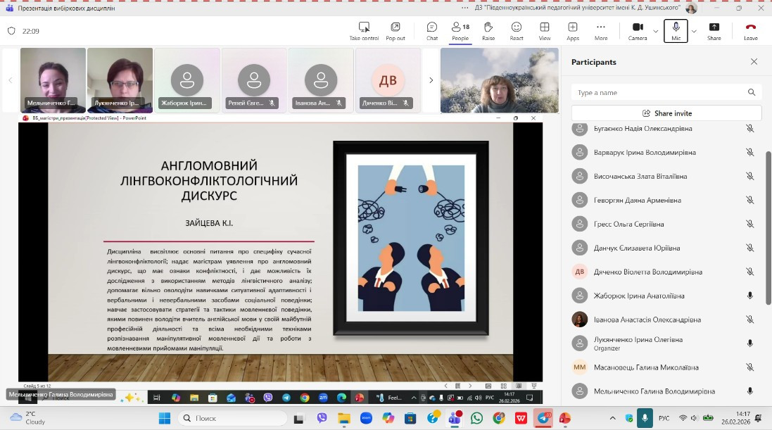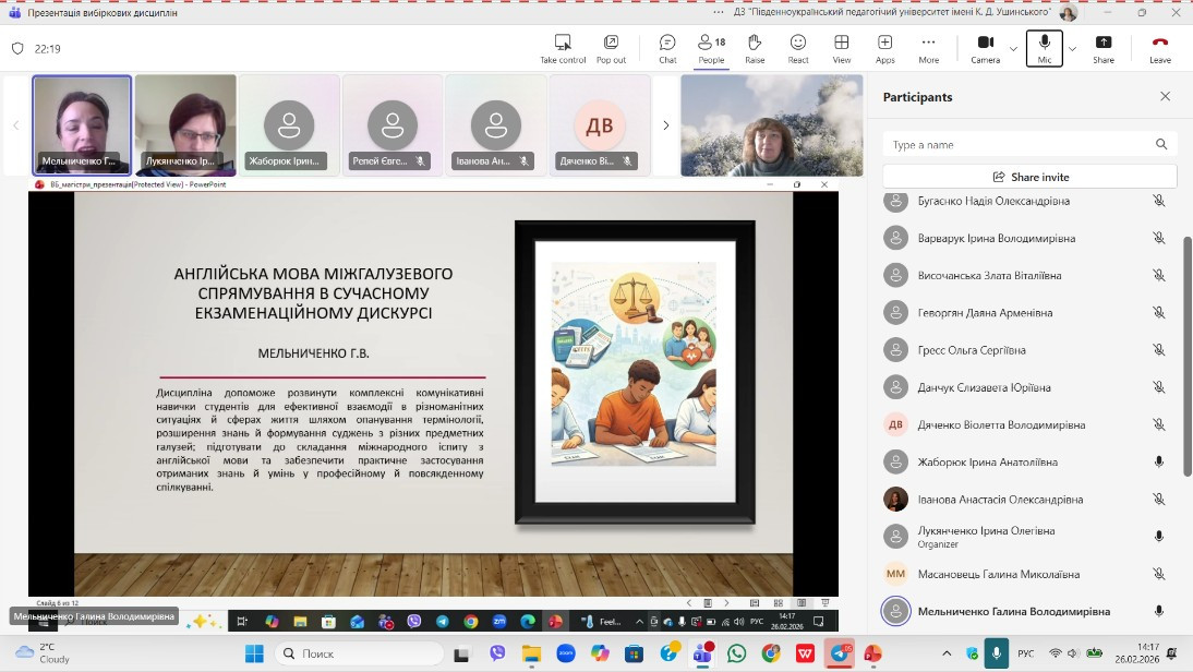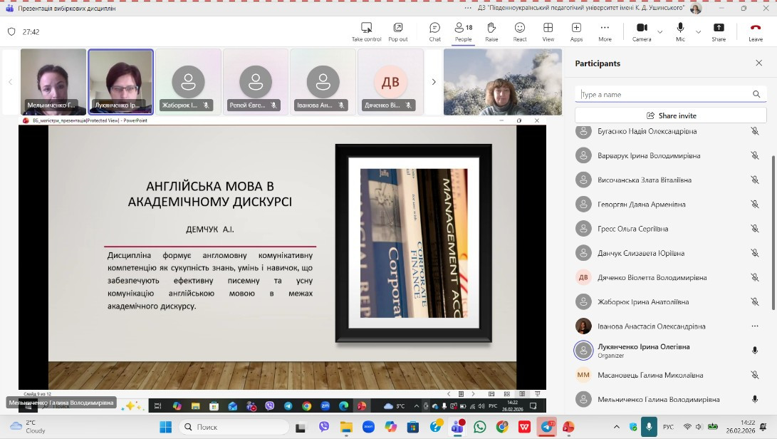 26 лютого 2026 року відбулася презентація вибіркових дисциплін для здобувачів другого (магістерського) рівня вищої освіти освітньо-професійної програми «Середня освіта (Англійська мова і зарубіжна література)» на 2026–2027 навчальний рік. Під час презентації було висвітлено мету вибіркових дисциплін, очікувані результати навчання, зміст навчальних курсів, а також ключові теми, що пропонуються для опанування. Здобувачі мали змогу ознайомитися з переліком вибіркових компонентів, поставити запитання та отримати детальну інформацію щодо особливостей їх вивчення.
