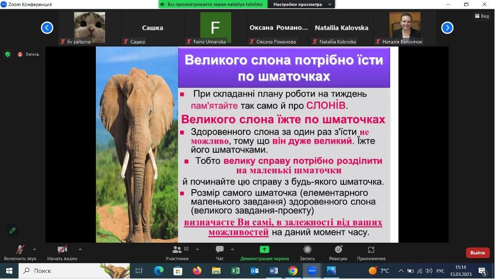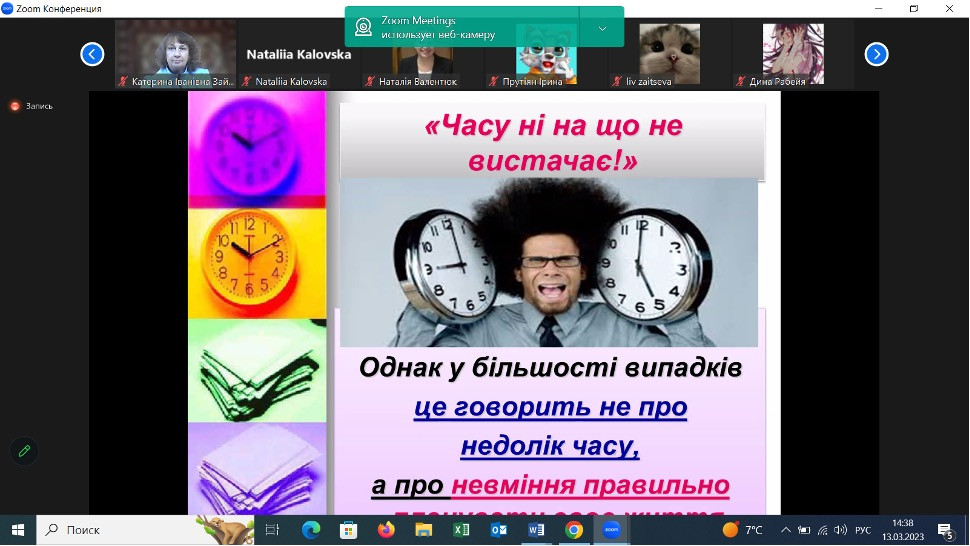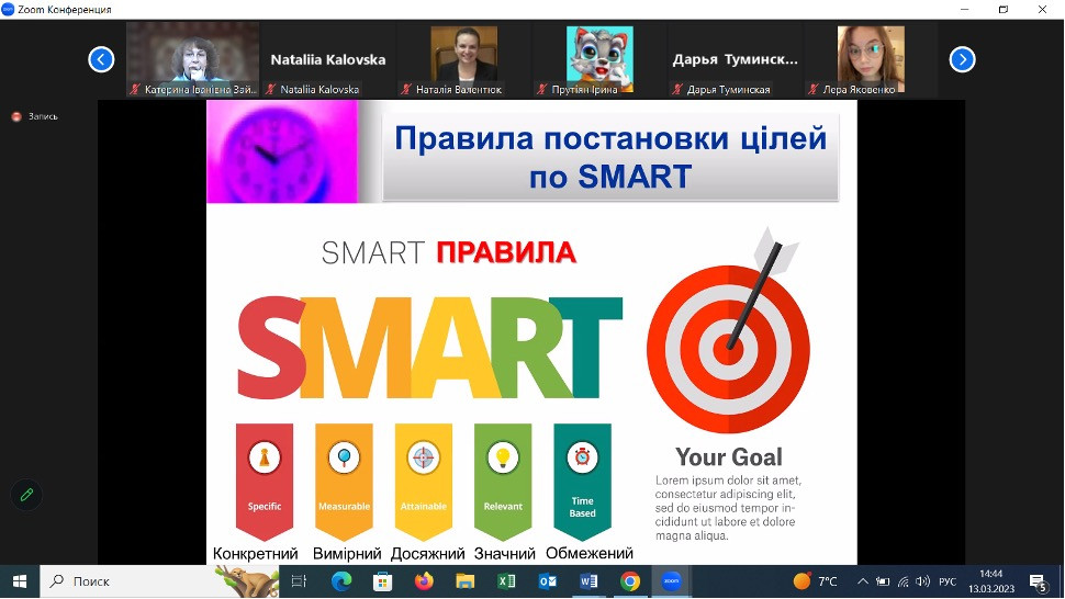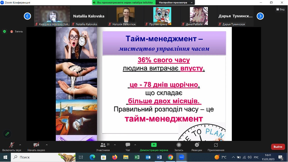 3 березня 2023 року в межах співпраці між ЗВО – партнерами на запрошення гаранта ОПП «Середня освіта (Мова і література (англійська))» другого (магістерського) рівня вищої освіти проф. Т.Є. Єременко та за сприянням доц. Н.О. Валентюк відбулася зустріч з кандидатом економічних наук, доцентом кафедри менеджменту Одеського державного аграрного університету, Н.О. Теличко, яка провела гостьову лекцію-тренінг на тему «Тайм-менеджмент – навчись керувати своїм часом».