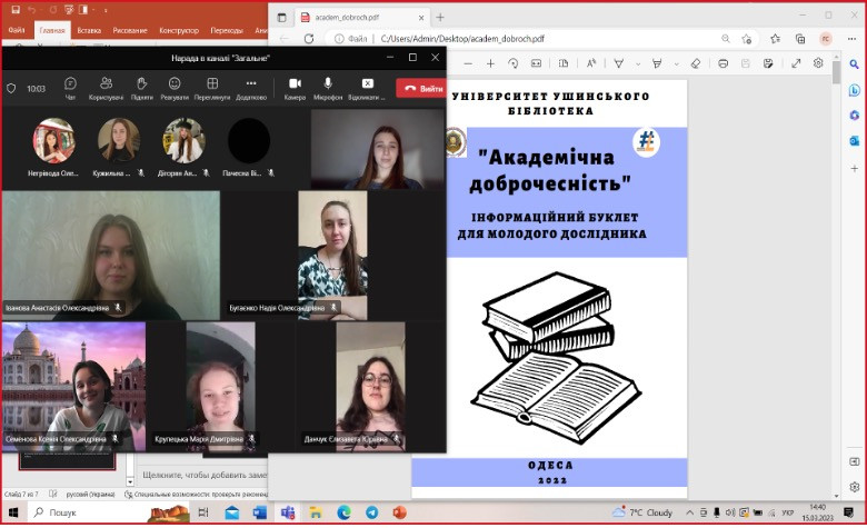 В межах проведення Тижня доброчесності в Університеті Ушинського викладачами кафедри германської філології та методики викладання іноземних мов (доц. К.І. Зайцева, доц. І.О. Лук’янченко, ст. викл. О.О. Негрівода, асист. А.В. Бошков) було проведено низку виховних заходів, присвячених проблемам академічної доброчесності в освітньому закладі, видам академічного плагіату, самоплагіату, фабрикації тощо для здобувачів освіти ОПП «Середня освіта (Мова і література (англійська))».