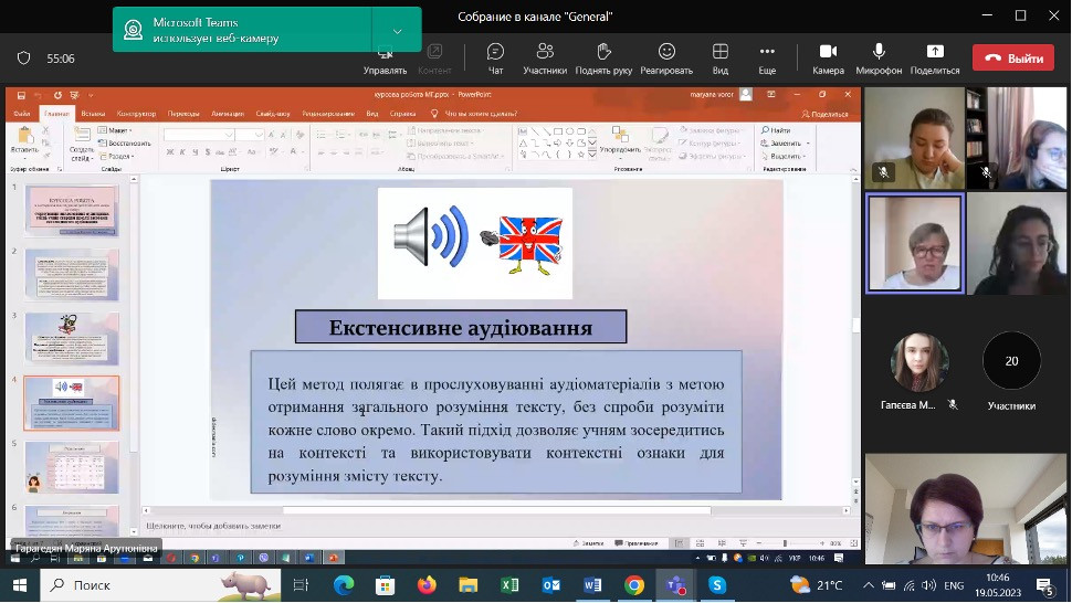 19 травня 2023 відбувся захист курсових робіт з основної іноземної мови/методики її викладання здобувачами першого (бакалаврського) рівня вищої освіти, які навчаються за спеціальністю 014.021 Середня освіта (Англійська мова та література) денної форми навчання. Коло наукових інтересів здобувачів охоплювало питання формування англомовної комунікативної компетентності школярів, використання інноваційних технологій в освітньому процесі з англійської мови, вивчення когнітивних, комунікативно-прагматичних та лінгвістичних особливостей англійськомовного дискурсу. Презентації результатів досліджень здобувачів супроводжувалися цікавими дискусіями, запитаннями та прикладами-підтвердженнями.