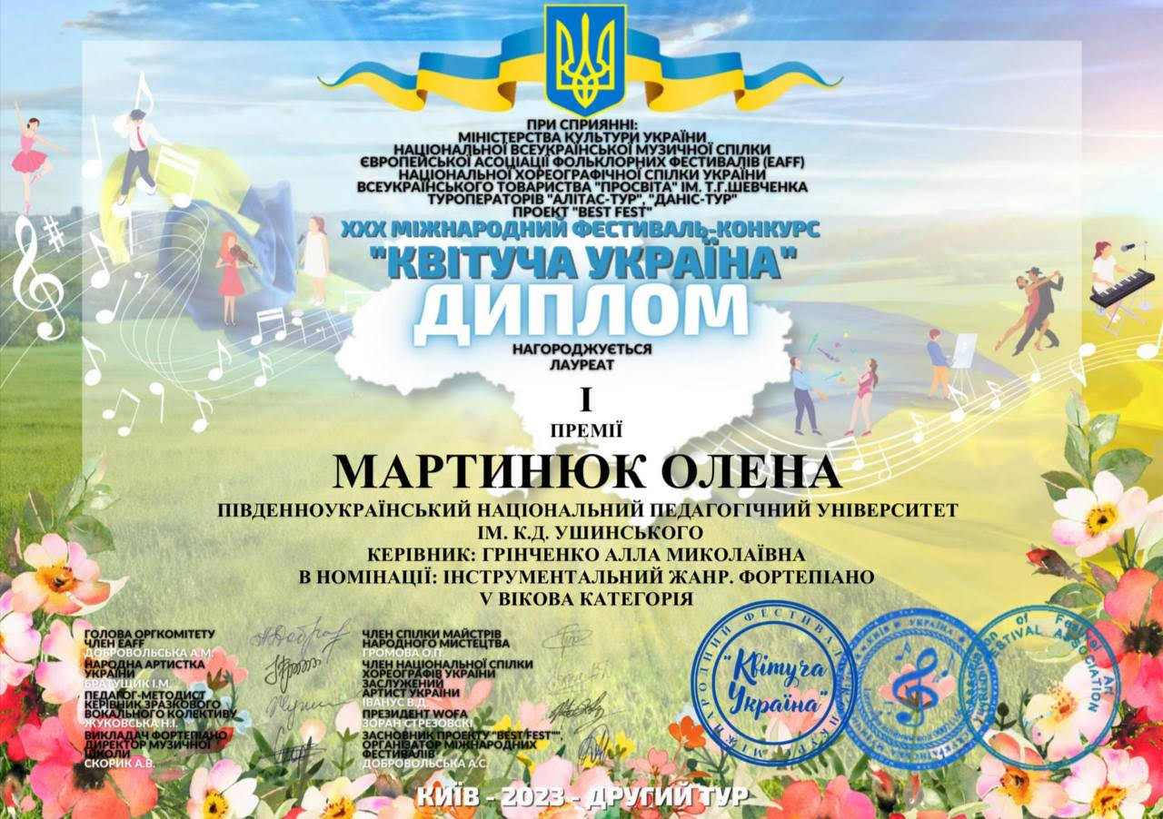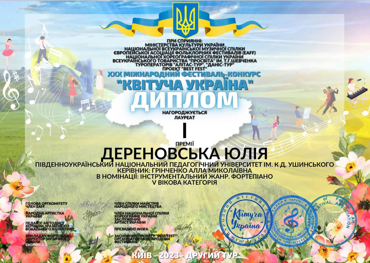 Вітаємо з яскравою і гідною перемогою студентів факультету музичної та хореографічної освіти Дереновську Юлію, Мартинюк Олену, Го Іно, які посіли перші місця в Міжнародному фестивалі-конкурсі «Квітуча Україна». Міжнародний багатожанровий двотуровий фестиваль-конкурс «Квітуча Україна» було проведено за підтримки Міністерства культури та інформаційної політики України, Київського Управління культури, туризму і охорони культурної спадщини, Оргкомітету "BEST FEST", Всеукраїнського товариства "Просвіта" ім. Т. Г. Шевченка, Європейської асоціації фестивалів (EAFF). До складу журі увійшли відомі артисти, педагоги творчих ВНЗ, режисери, керівники творчих колективів, діячі культури та мистецтв, які дали високу оцінку високому рівню професійної виконавської майстерності наших студентів та творчому підходу до інтерпретації творів.