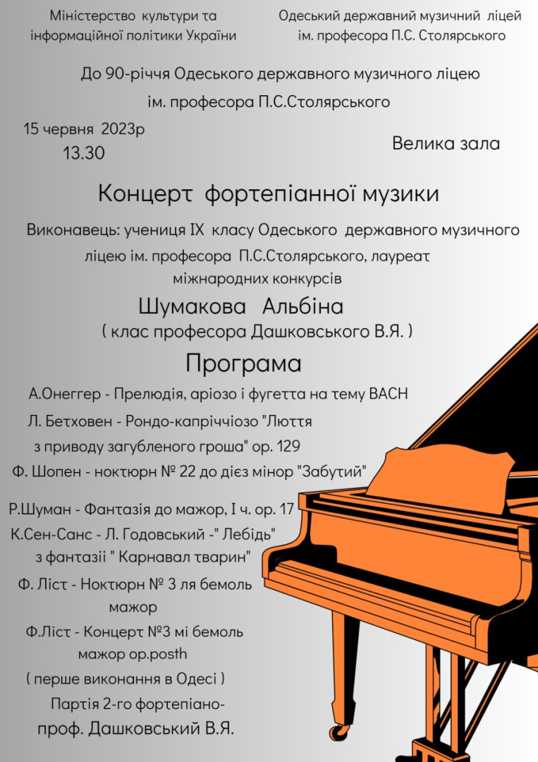 15 червня 2023 року здобувачами вищої освіти за спеціальностю 025 Музичне мистецтво було відвідано концерт фортепіанної музики в Одеському державному музичному ліцеї ім. П.С. Столярського.