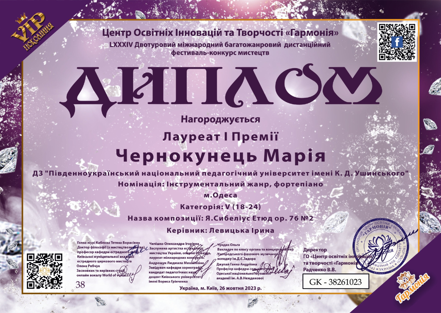 Студентка першого (бакалаврського) рівня першого року навчання ОПП «Музичне мистецтво» спеціальності 025 Музичне мистецтво Чернокунець Марія одержала звання лауреату І ступеня у Міжнародному багатожанровому дистанційному фестивалі-конкурсі мистецтв «VIP покоління», що пройшов у м. Київ 26 жовтня 2023 року.