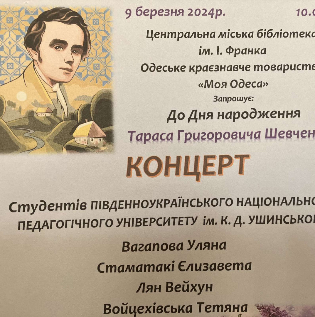 День народження Тараса Григоровича Шевченка – особлива дата для українців. Його називають нашим пророком, Великим Кобзарем і українським генієм. Минуло 210 років від народження Великого Кобзаря, проте, кожне слово, написане поетом, і досі актуальне. 9 березня 2024 року в Центральній міській бібліотеці ім. Івана Франка відбувся концерт студентів факультету музичної та хореографічної освіти, присвячений 210-річчю від дня народження поета. Публіка надзвичайно тепло зустрічала виступи Діани Фартушної, Ганни Васіленко, Крістіни Бродецької, Уляни Вагапової, Єлизавети Стаматакі, Лян Вейхуна, Тетяни Войцехівської, у виконанні яких пролунали відомі твори українських композиторів. Щиро дякуємо всім учасникам та організаторам концерту за вшанування пам‘яті великого Кобзаря! Дякуємо Збройним Силам України за можливість тримати культурний фронт!
