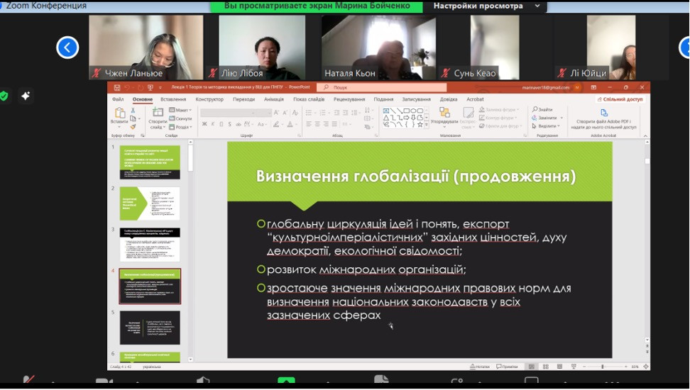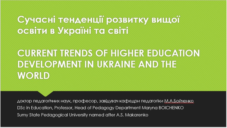 29 березня 2024 року в межах програми «Гостьовий лектор» для аспірантів спеціальностей 011 ОНП «Освітні педагогічні науки» та «Мистецька педагогіка вищої освіти», 014 Середня освіта (Музичне мистецтво), 015 Професійна освіта для наукових керівників було проведено зустріч з докторкою педагогічних наук, професоркою, завідувачкою кафедри педагогіки Сумського державного педагогічного університету імені А.С.Макаренка Бойченко Мариною Анатоліївною. У якості гостьового лектора професорка Бойечнко виступила з цікавою лекцією на тему: СУЧАСНІ ТЕНДЕНЦІХ РОЗВИТКУ ВИЩОЇ ОСВІТИ В УКРАЇНІ І СВІТІ (CURRENT TRENDS OF HIGHER EDUCATION DEVELOPMENT IN UKRAINE AND THE WORLD; 乌克兰和世界高等教育发展的当前趋势).