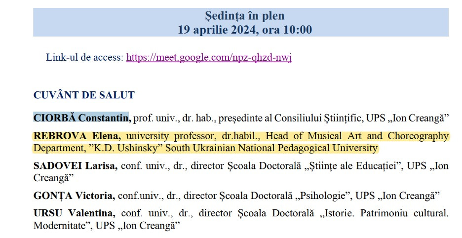 19 квітня 2024 року аспірантка кафедри музичного мистецтва і хореографії спеціальності 011 Освітні, педагогічні наук, ОНП «Мистецька педагогіка вищої освіти» Добруха Валерія, яка проходить програму міжнародної академічної мобільності в Кишинівському державному педагогічному університеті імені Іона Крянге виступила на Міжнародній конференції