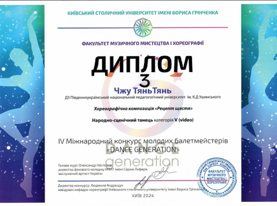 Магістранти спеціальності 024 Хореографія Лі Пейін, Хуан Бей і випускниця 2023-2024 навчального року Чжу Тяньтянь посіли призові місця на ІУ Міжнародному конкурсі молодих балетмейстерів «DANCE GENERATION», який пройшов на базі Київського столичного університету імені Бориса Грінченко.