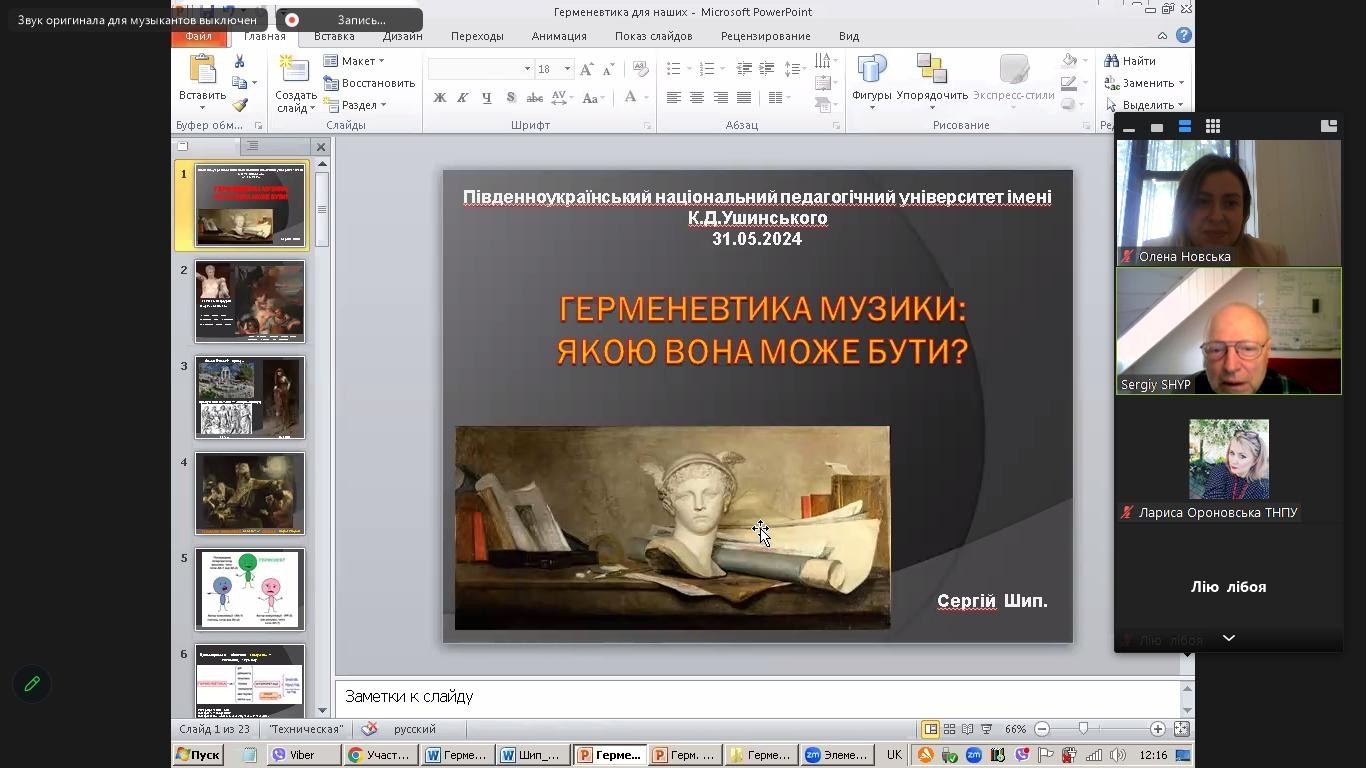 31 травня на факультеті музичної та хореографічної освіти з нагоди святкування Дня науки в Україні відбулася відкрита лекція доктора мистецтвознавства, професора кафедри музичного мистецтва і хореографії Університету Ушинського, члена Європейської академії наук, голови наукової школи «Теорія музичної мови і семіотичні основи педагогічної герменевтики» Сергія Васильовича Шипа на тему «МУЗИЧНА ГЕРМЕНЕВТИКА. ЯКОЮ ВОНА МОЖЕ БУТИ?».