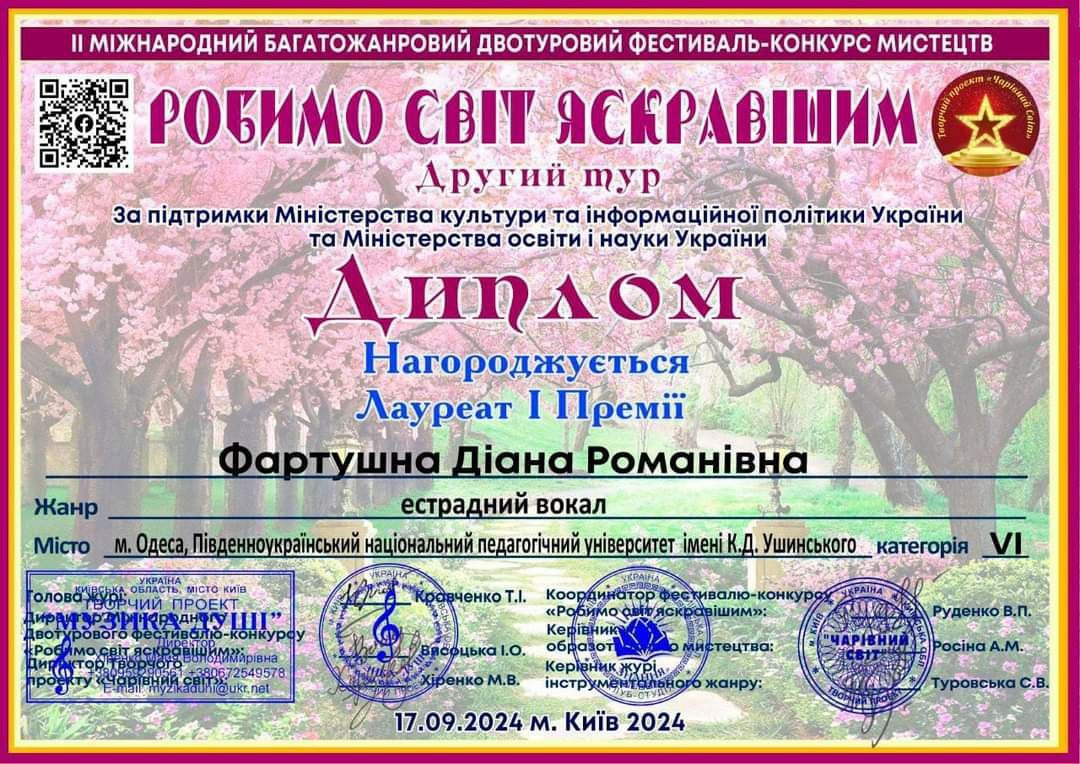 Вітаємо наших здобувачів з прекрасними результатами на ІІ Міжнародному багатожанровому двотуровому фестивалі-конкурсі мистецтв РОБИМО СВІТ ЯСКРАВІШИМ!