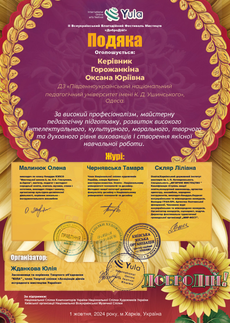 Звання Лауреату 1 ступеня у Всеукраїнському двотуровому фестивалі-конкурсі мистецтв «ДоброДій» в м. Харків отримав Юй Ціцзя - здобувач другого (магістерського) рівня освіти (клас доцента Горожанкіної О. Ю.).